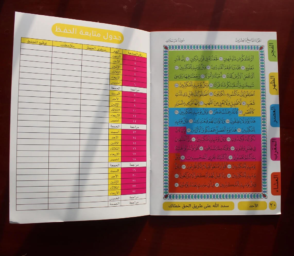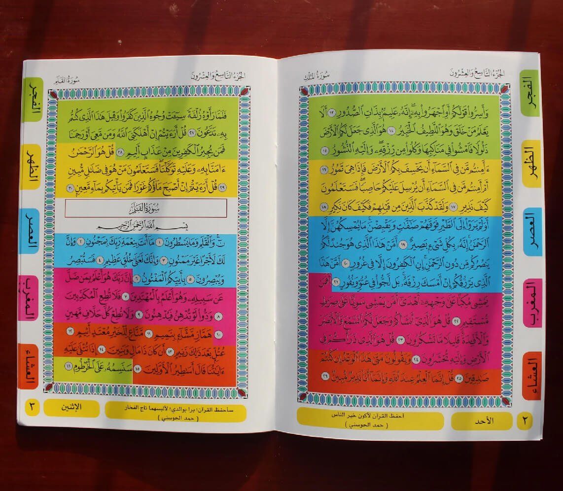 جزء تبارك _ المصحف المحفظ ، يعد خيار رائع لأطفالك في كل صفحة من المصحف المحفظ ٥ ألوان زاهية؛ لينجذب الطفل إليه، ولكي يسهل تقسيم الحفظ إلى ٥ أوقات مختلفة.